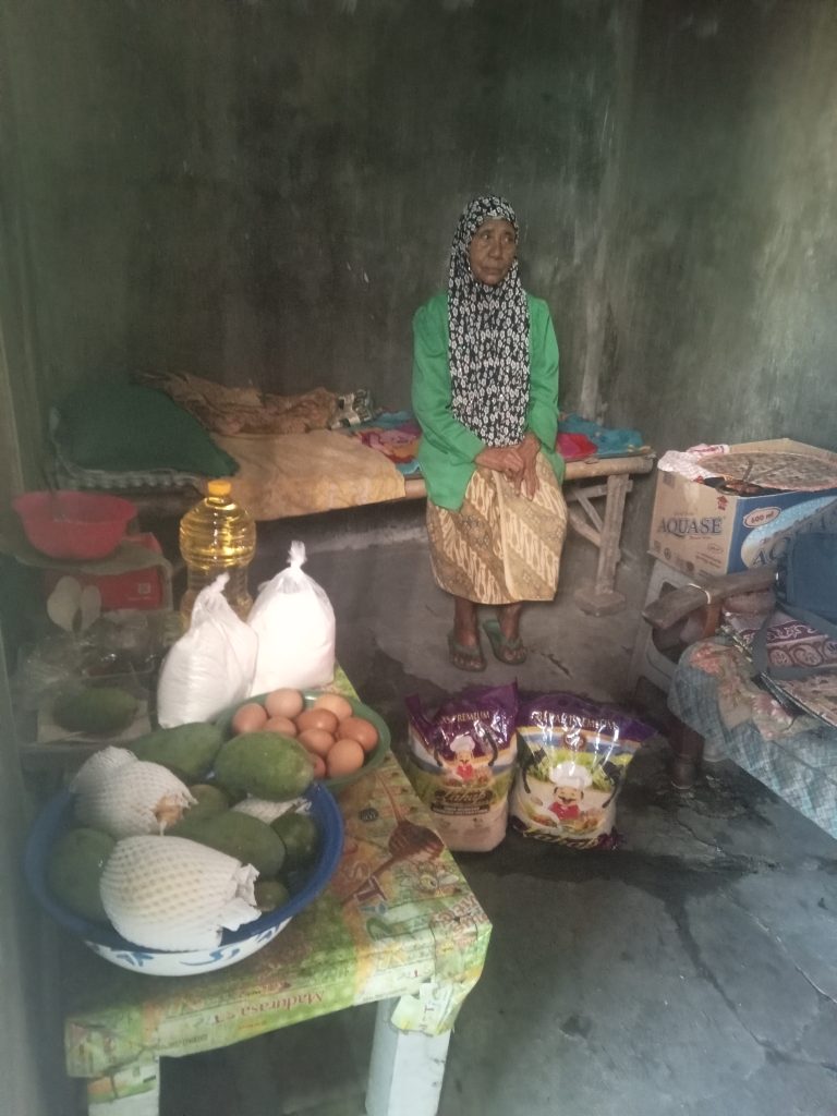 Bantuan pagi ini di salurkan kepada seorang nenek tua lanjut usia, kira kira beliau berumur sudah 80 tahunan yang bernama mbah Jemani, Beliau seorang janda sebatang kara yang sehari hari tidak bisa bekerja dan hanya mengandalkan bantuan dari para tetangga di desa.