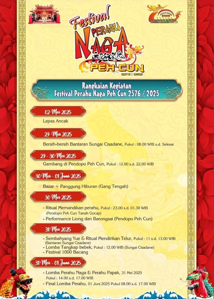 Berikut adalah berbagai macam kegiatan yg akan di gelar oleh panitia festival pecun dimana perkumpulan keagamaan Boen Tek Bio sebagai pelaksana nya , yg akan di gelar   mulai tgl 31 mei  sampai 1 Juni 2025 bertempat di pusat kota Tangerang di sekitaran kali pasir pinggiran sungai Cisadane .