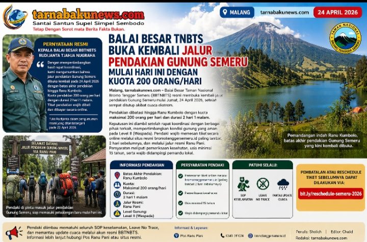 ” Dengan mempertimbangkan hasil rapat koordinasi, kami mengumumkan bahwa jalur pendakian Gunung Semeru dibuka kembali pada 24 April 2026 dengan batas akhir hingga Ranu Kumbolo. Kuota pendakian 200 orang per hari dengan durasi 2 hari 1 malam. Tiket pendakian wajib dibeli dan dibayar secara online,” ujarnya dalam keterangan resmi tertanggal 22 April 2026.