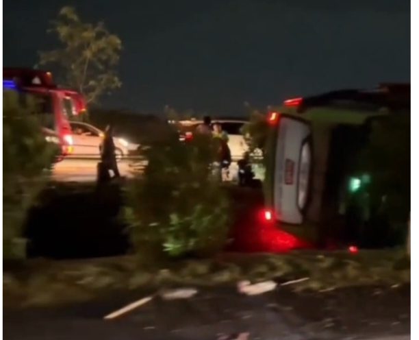 Bus dalam posisi terbalik masuk ke parit median tol, menyebabkan, 1 penumpang meninggal dunia, dan, 11 lainnya mengalami luka berat.