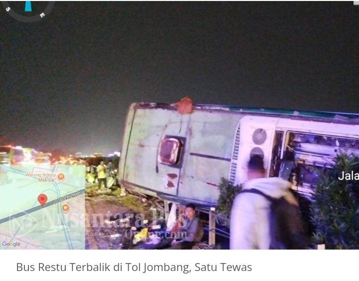 Jombang–Mojokerto, tarnabakunews.com, 2 April 2026 –** Bus Restu mengalami kecelakaan tunggal hingga terguling di ruas Tol Jombang–Mojokerto (Jomo), KM 689+500A, jalur dari Jombang menuju Surabaya, Kamis malam sekitar pukul 20.00 WIB.