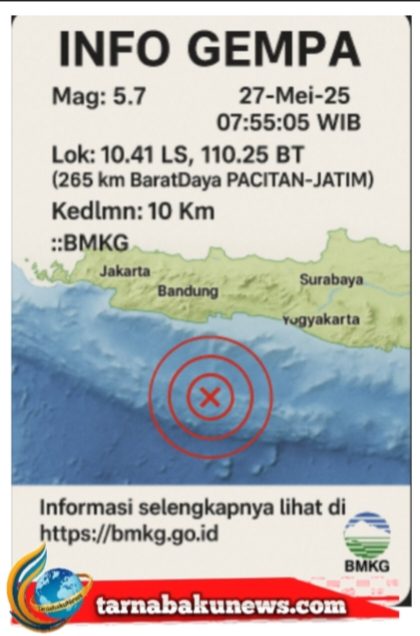GEMPA MAGNITUDO 5,7 GUNCANG BARAT DAYA PACITAN, TIDAK BERPOTENSI TSUNAMI Tarnabhakunews.com Pacitan, Jawa Timur | 27 Mei 2025 Badan Meteorologi,…