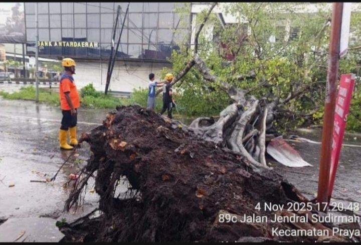 Lombok Tengah, NTB, tarnabakunews.com – 4 November 2025, wilayah Kecamatan Praya, Kabupaten Lombok Tengah dilanda cuaca ekstrem berupa hujan deras disertai angin kencang yang berlangsung sejak sore hari sekitar pukul 15.30 WITA. Bencana alam ini mengakibatkan sedikitnya 18 unit rumah warga di daerah Kampung Jawa dan Tiwu Bokah terendam banjir, serta sejumlah pohon tumbang yang mengganggu arus lalu lintas di beberapa titik.