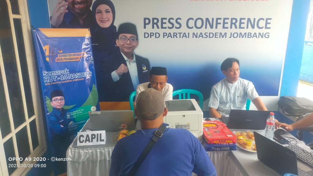 Jombang, Tarnabhakunews.com Dalam semangat memperkuat Gerakan Perubahan menuju Indonesia yang lebih baik, Dewan Pimpinan Daerah (DPD) Partai NasDem Kabupaten Jombang memperingati Hari Ulang Tahun (HUT) ke-14 partai dengan menggelar kegiatan sosial yang menyentuh langsung kebutuhan masyarakat. Kegiatan ini berlangsung di Sekretariat DPD NasDem Jombang, Jalan Kepatihan No. 5 Gang 4, pada Senin (20/10/2025).