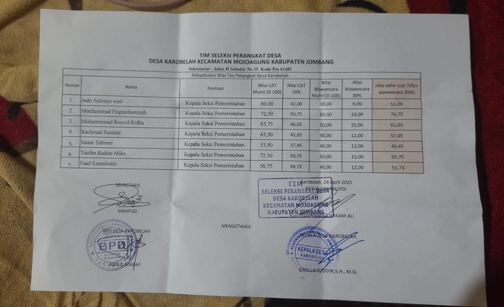 Jombang,|Mojoagung, Tarnabakunews.com — Dugaan praktik jual-beli jabatan dalam seleksi perangkat desa Karobelah, Kecamatan Mojoagung, Jombang, menguat setelah sejumlah peserta seleksi mempertanyakan perubahan sepihak dalam proses penilaian. Kepala Desa Karobelah, Shollahuddin, disinyalir merubah kesepakatan musyawarah tanpa persetujuan bersama, memicu kekecewaan peserta dan warga desa.