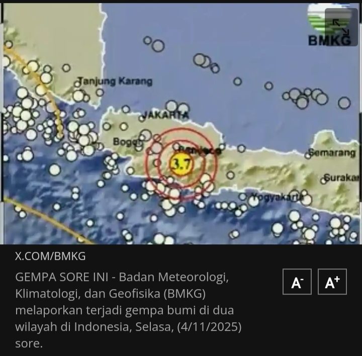 Bandung, tarnabakunews.com, 4 November 2025 — Pada hari Selasa, 4 November 2025 pukul 17.04 WIB, wilayah Kabupaten Bandung diguncang gempa bumi tektonik dengan magnitudo 3,0. Berdasarkan data resmi dari Badan Meteorologi, Klimatologi, dan Geofisika (BMKG), pusat gempa terletak di darat sekitar 20 km tenggara Kabupaten Bandung dengan kedalaman 4 km.