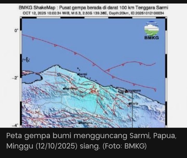 Sarmi, Papua, tarnabakunews.com, 12 Oktober 2025 – Gempa bumi dengan kekuatan Magnitudo 5,3 mengguncang wilayah Sarmi, Papua, pada Minggu pagi pukul 10:00 WIB. Pusat gempa berada sekitar 100 kilometer tenggara Sarmi dengan kedalaman 20 kilometer di bawah permukaan tanah, demikian laporan dari Badan Meteorologi Klimatologi dan Geofisika (BMKG).