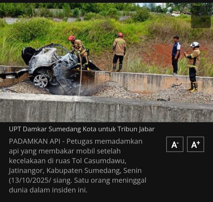 Sumedang, Jawa Barat, tarnabakunews.com, 14 Oktober 2025, Sebuah kecelakaan tunggal terjadi di KM 158 Tol Cisumdawu, Desa Cibaeusi, Kecamatan Jatinangor, Kabupaten Sumedang pada Senin siang, 13 Oktober 2025. Minibus Toyota Raize bernomor polisi D 1027 UBK menabrak pembatas jalan hingga terbelah dua dan terbakar hebat. Sopir yang mengendarai minibus tersebut ditemukan meninggal dunia di lokasi kejadian.