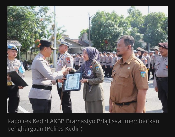 Kediri, tarnabakunews.com, 4 November 2025 — Polres Kediri menggelar upacara pemberian penghargaan kepada 53 penerima terdiri dari 38 personel Polres Kediri dan 15 masyarakat yang dianggap berprestasi serta berperan aktif mendukung tugas kepolisian. Upacara berlangsung di Lapangan Apel Mapolres Kediri dan dipimpin langsung oleh Kapolres Kediri AKBP Bramastyo Priaji, diikuti oleh Kapolsek jajaran, Pejabat Utama (PJU) dan anggota Polres Kediri.