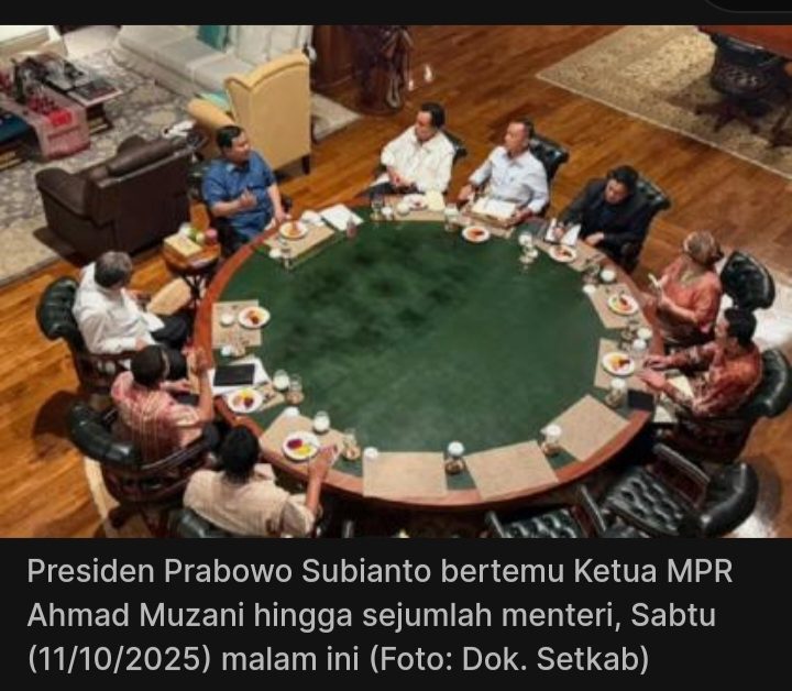 Presiden Republik Indonesia Prabowo Subianto menggelar rapat strategis di kediamannya di Hambalang, Bogor, bersama Ketua Majelis Permusyawaratan Rakyat (MPR) Ahmad Muzani, Kepala Badan Intelijen Negara (BIN) Muhammad Herindra, serta sejumlah pejabat tinggi negara lainnya.
