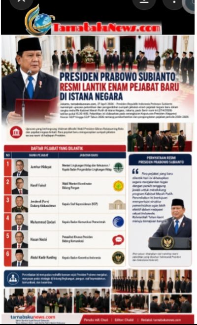 Jakarta, tarnabakunews.com, 27 April 2026 – Presiden Republik Indonesia, Prabowo Subianto, secara resmi melantik dan mengambil sumpah jabatan enam pejabat negara baru dalam rangka reshuffle Kabinet Merah Putih. Prosesi pelantikan berlangsung di Istana Negara, Jakarta, pada Senin (27/4/2026) sekitar pukul 15.00 WIB.