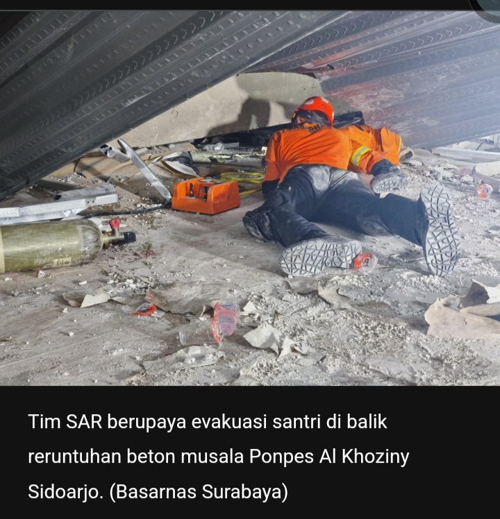 Sekretaris Daerah Provinsi Jawa Timur, Adhy Karyono, menyampaikan bahwa masih terdapat tujuh santri yang terjebak reruntuhan di beberapa sektor bangunan. “Mereka masih bisa berkomunikasi dengan tim evakuasi sehingga kami optimistis bisa menyelamatkan mereka,” ujarnya.